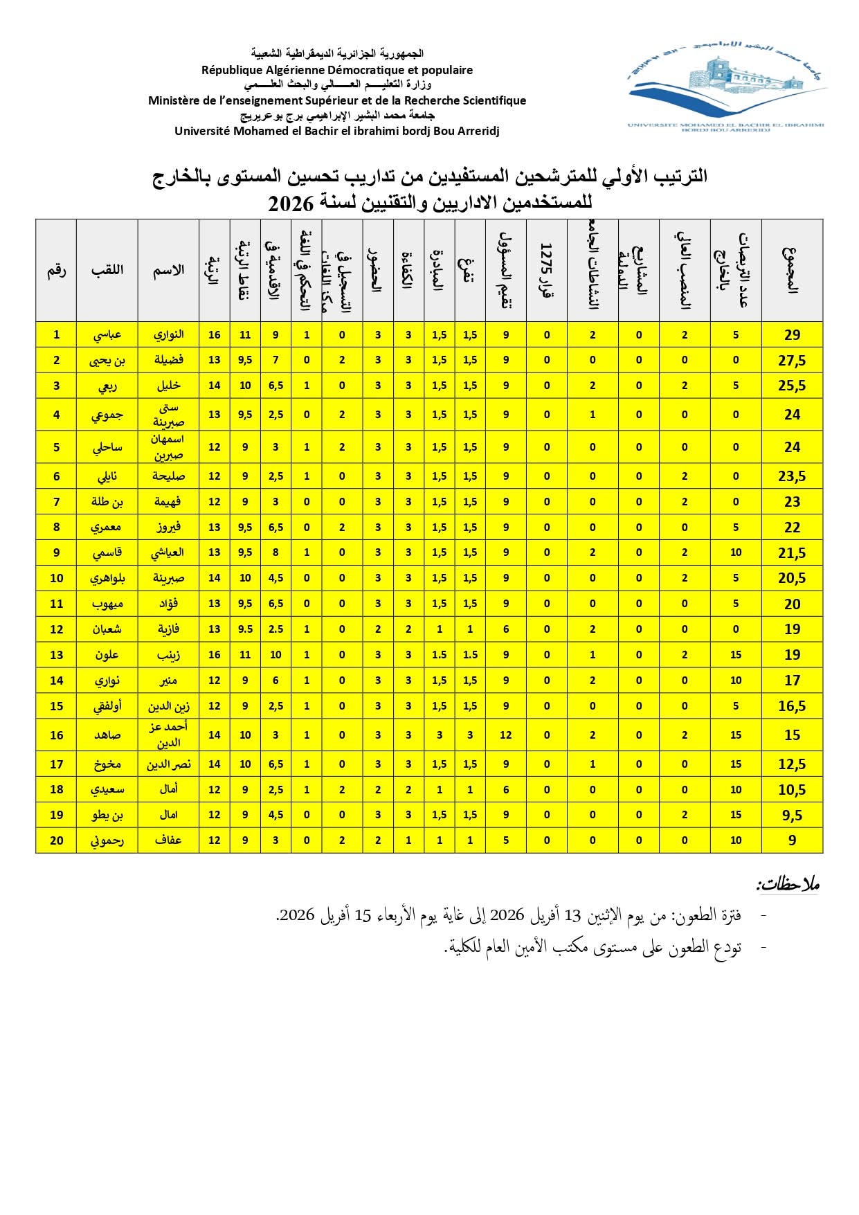 الترتيب الأولي للمترشحين المستفيدين من تداريب تحسين المستوى بالخارج للمستخدمين الاداريين والتقنيين لسنة 2026